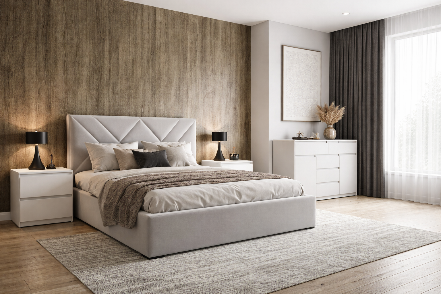 Комплект создаёт современное и функциональное пространство: кровать дарит уютный отдых и дополнительное место для хранения, тумба помогает держать необходимые вещи под рукой, а вместительный комод позволяет удобно организовать вещи и поддерживать порядок в спальне.