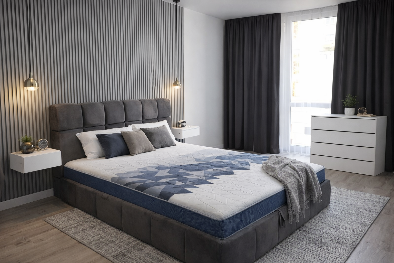 Комплект создаёт удобное и продуманное пространство: кровать с нишей позволяет удобно хранить постельное бельё, тумба держит необходимые мелочи под рукой, а комод помогает поддерживать порядок в спальне.