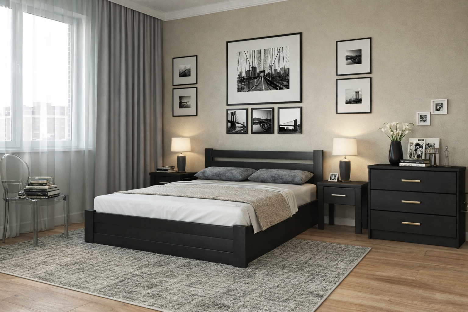 Продуманная комплектация – кровать, тумба и комод создают удобное и функциональное пространство для отдыха и хранения вещей.