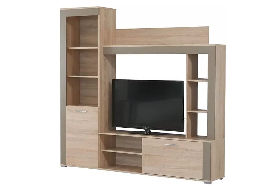 Комплект состоит из ТВ-тумбы, закрытых и открытых отделений, что позволяет максимально функционально использовать пространство возле телевизора, сохраняя эту зону аккуратной и визуально лёгкой.