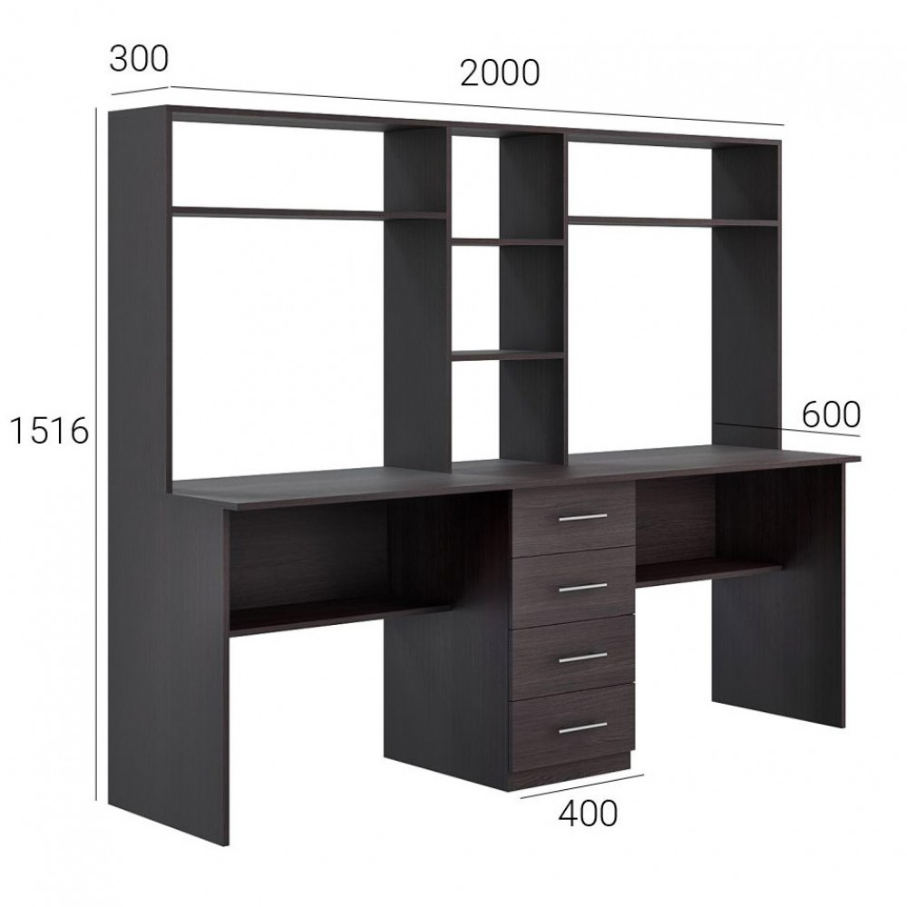 Стол изготовлен из качественного ламинированного ЛДСП, которое отличается прочностью и устойчивостью к ежедневной эксплуатации. Поверхность легко очищается и сохраняет аккуратный внешний вид длительное время. Конструкция включает четыре вместительных ящика для хранения документов, канцелярии и личных вещей. Дополнительные открытые полки позволяют удобно разместить книги, тетради или декоративные элементы. Ящики оснащены роликовыми направляющими, обеспечивающими плавное выдвижение, а металлические реллинговые ручки гарантируют удобство использования и подчеркивают современный стиль модели. Просторная рабочая поверхность позволяет одновременно разместить два ноутбука или компьютера, создавая комфортные условия для учебы и работы сразу двух пользователей. Стол поставляется в разобранном виде и комплектуется инструкцией и полным набором фурнитуры для монтажа.