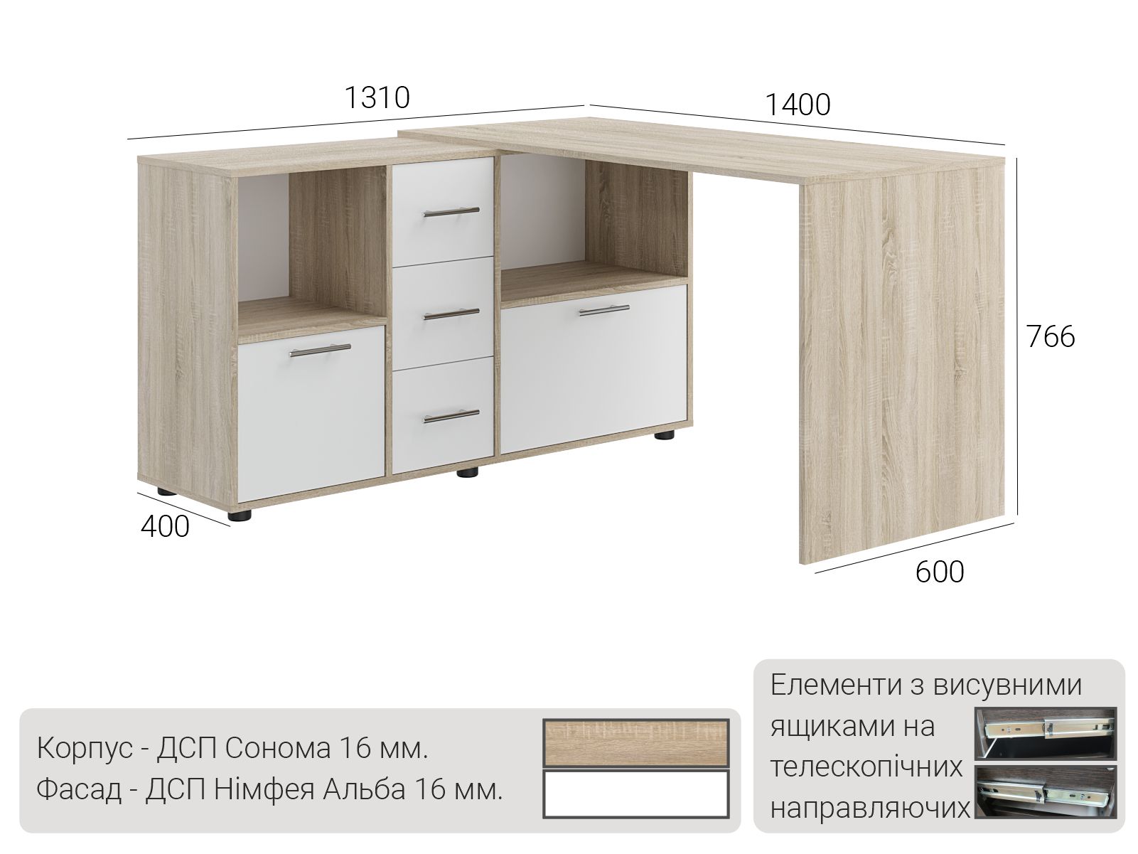 Стол изготовлен из ламинированного ДСП — прочного и износостойкого материала, который легко очищается и сохраняет аккуратный внешний вид длительное время. Сочетание Дуб Сонома / Нимфея альба создает стильный контраст и придает мебели современный характер. Модель оснащена четырьмя вместительными ящиками на телескопических направляющих, которые обеспечивают плавное и тихое выдвижение. Две открытые ниши позволяют удобно разместить книги и часто используемые предметы, а две закрытые полки за дверцами помогают скрыть вещи и поддерживать порядок в рабочей зоне. Просторная столешница подходит для размещения компьютера, ноутбука, документов и письменных принадлежностей, создавая комфортные условия для учебы или работы. Стол поставляется в разобранном виде и комплектуется инструкцией и полным набором фурнитуры для сборки.
