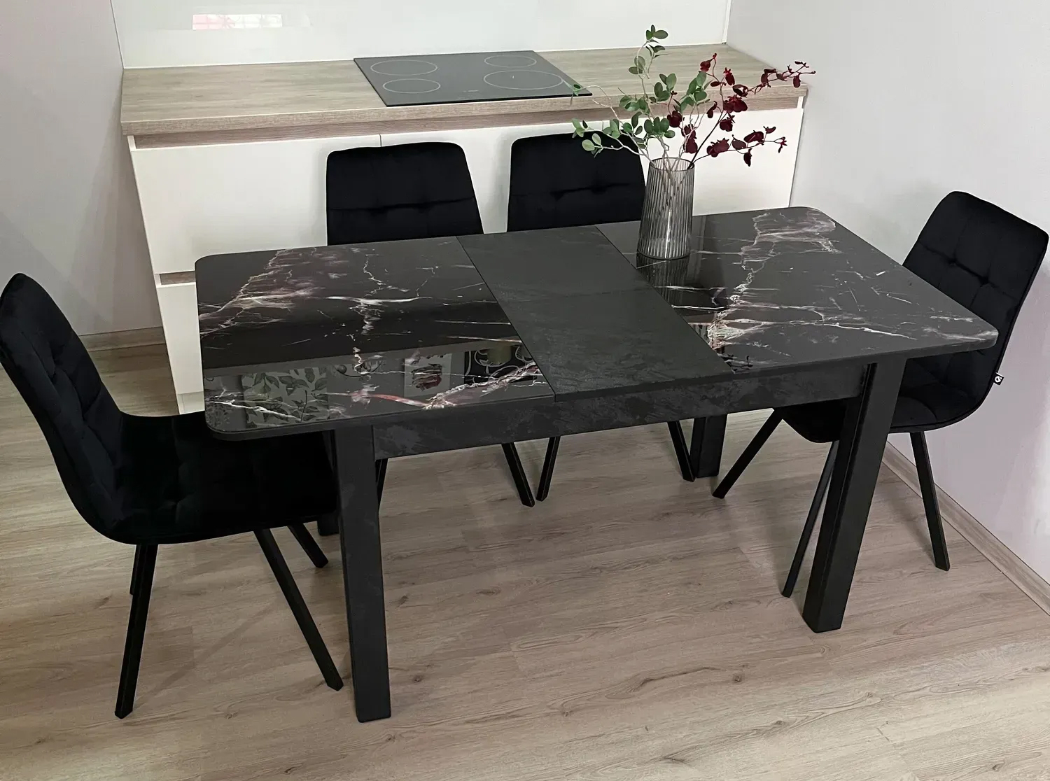 HPL (High Pressure Laminate) — ламинат высокого давления, известный своей износостойкостью, устойчивостью к влаге, царапинам, высоким температурам и ультрафиолетовому излучению. - Синхронный механизм — позволяет легко увеличить размер столешницы для большой компании.