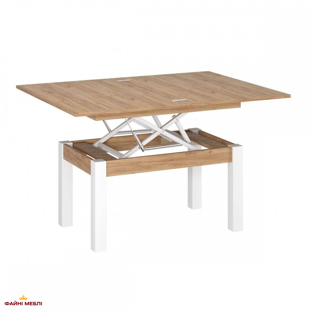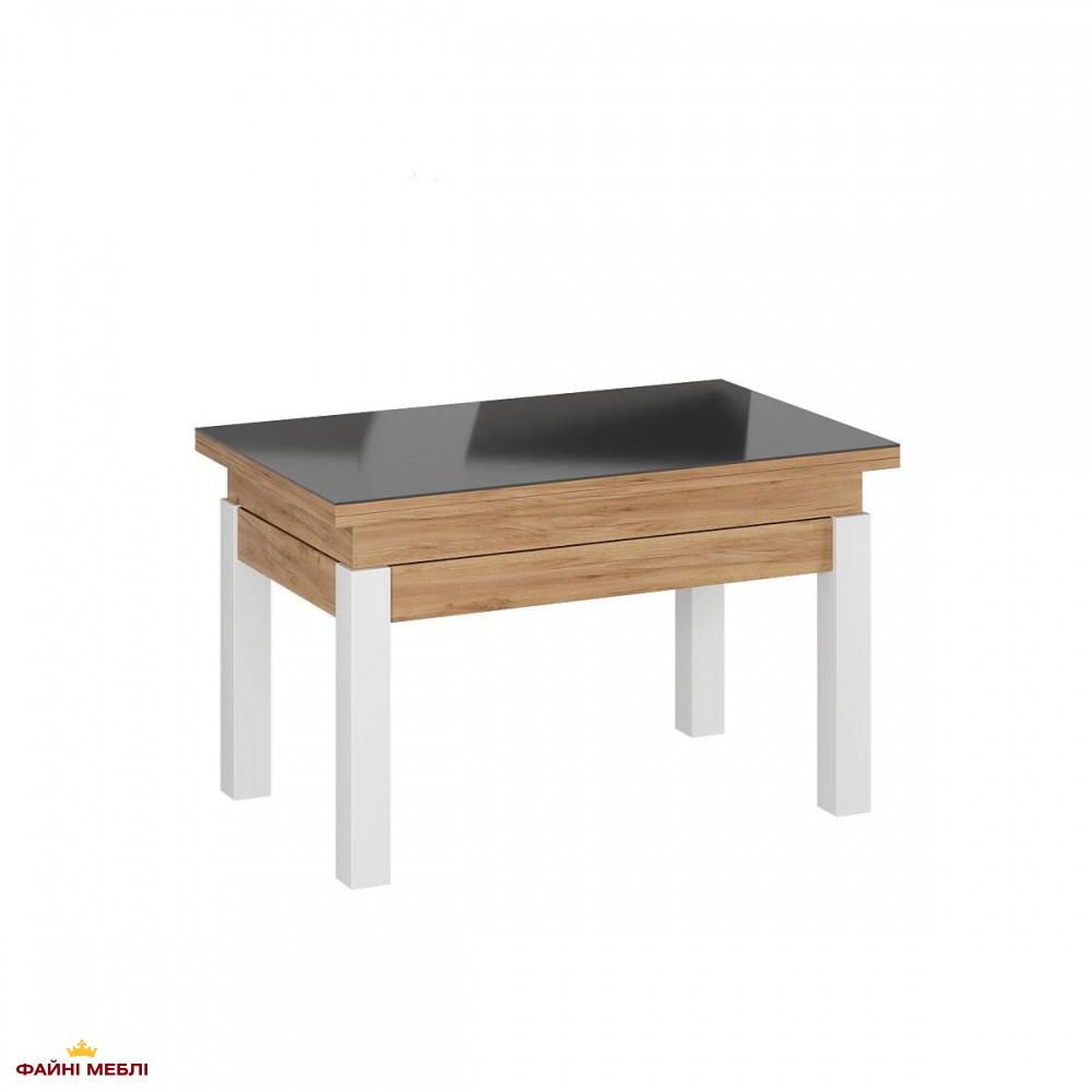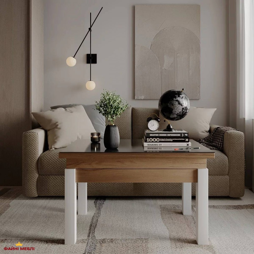Стол-трансформер B-Fly Glass Art In Head в сочетании тёплого оттенка Дуб крафт золотой, белых деревянных ножек и контрастного Графитового стекла создаёт выразительный баланс природности и современной графики. Золотистый древесный корпус наполняет интерьер теплом и динамикой текстуры, придавая пространству живой характер. Белые ножки визуально облегчают конструкцию, формируя чистую геометрию, тогда как тёмная стеклянная поверхность подчёркивает глубину цвета и делает модель более акцентной. Столешница и корпус выполнены из ЛДСП толщиной 16 мм и дополнены закалённым стеклом, что гарантирует устойчивость к нагрузкам и простоту ухода. Прочные деревянные ножки обеспечивают стабильность, а металлический механизм из трубы и пружинной стали позволяет плавно изменять формат стола. В базовом виде это компактный журнальный стол, однако благодаря наличию механизма трансформации модель переходит в полноценный обеденный формат: высота увеличивается с 51 до 75 см, а ширина — с 60 до 120 см. Такая функциональность делает стол практичным выбором для современных квартир с гибким пространством.