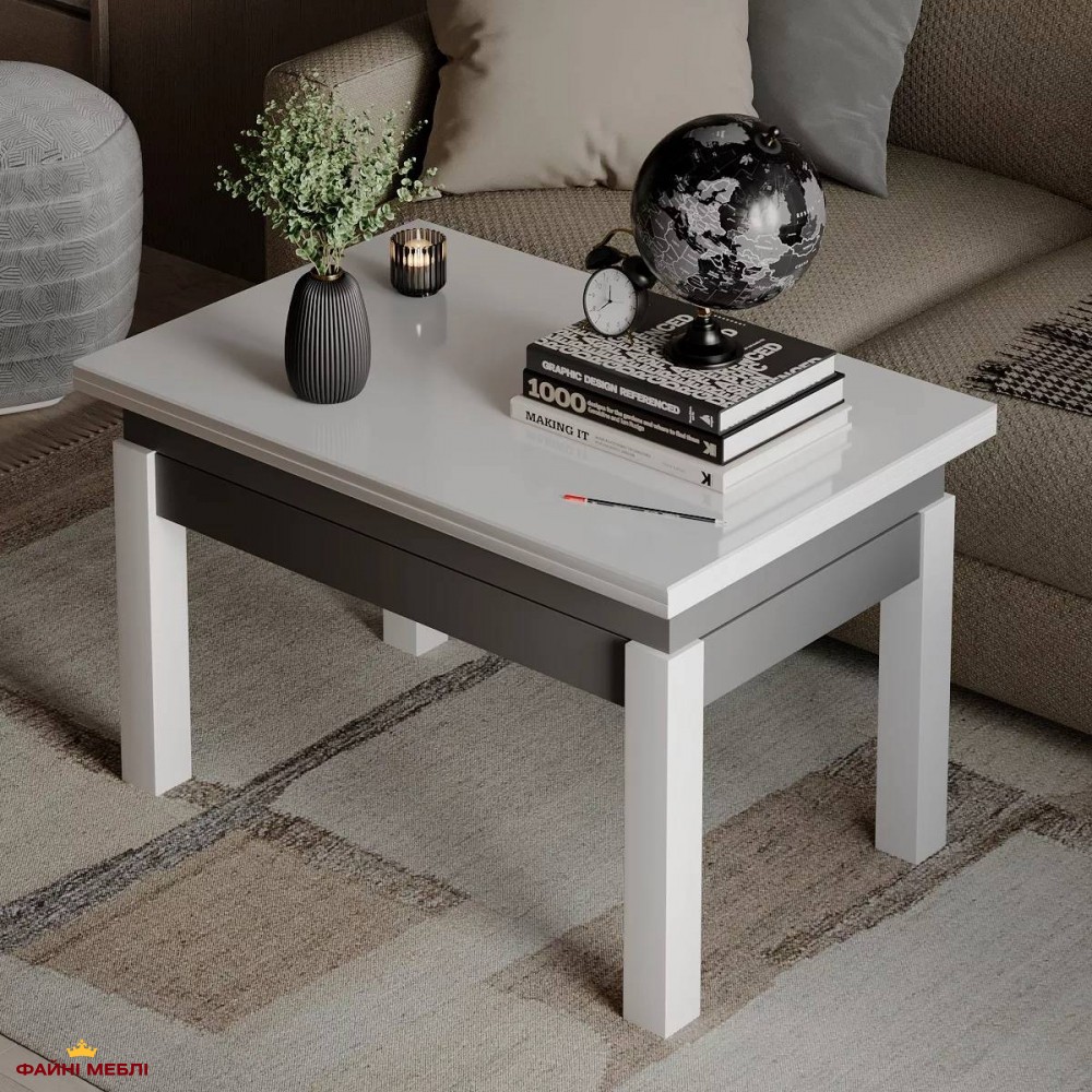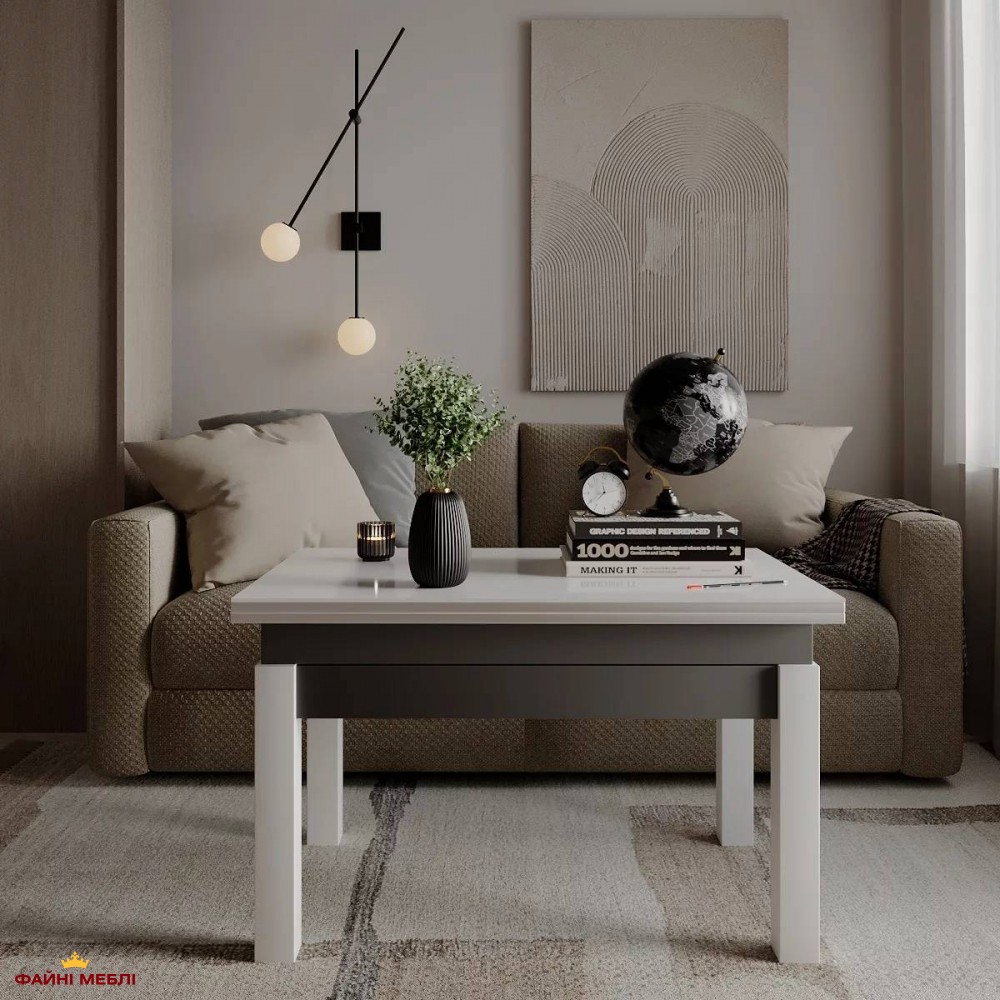Стол-трансформер B-Fly Glass Art In Head в сочетании глубокого Графита, контрастных белых ножек и чистого Белого стекла выглядит как продуманный элемент современной архитектуры интерьера. Тёмный корпус формирует чёткую основу композиции, задавая пространству ритм и глубину, тогда как светлые деревянные ножки добавляют лёгкости и визуального подъёма. Белое закалённое стекло создаёт эффект открытой поверхности, отражающей свет и усиливающей ощущение простора. Столешница и корпус выполнены из ЛДСП толщиной 16 мм и дополнены стеклом, что обеспечивает прочность и износостойкость в ежедневном использовании. Конструкцию поддерживают натуральные деревянные ножки, а надёжный металлический механизм из трубы и пружинной стали позволяет без усилий менять формат стола. В сложенном состоянии это сдержанный журнальный стол для повседневных задач, однако благодаря наличию механизма трансформации модель быстро переходит в расширенный формат: высота увеличивается с 51 до 75 см, а ширина — с 60 до 120 см. Такая гибкость делает стол уместным в динамичных пространствах, где мебель должна адаптироваться к разным сценариям