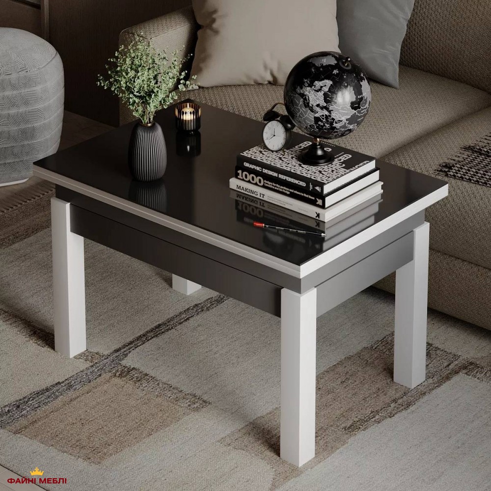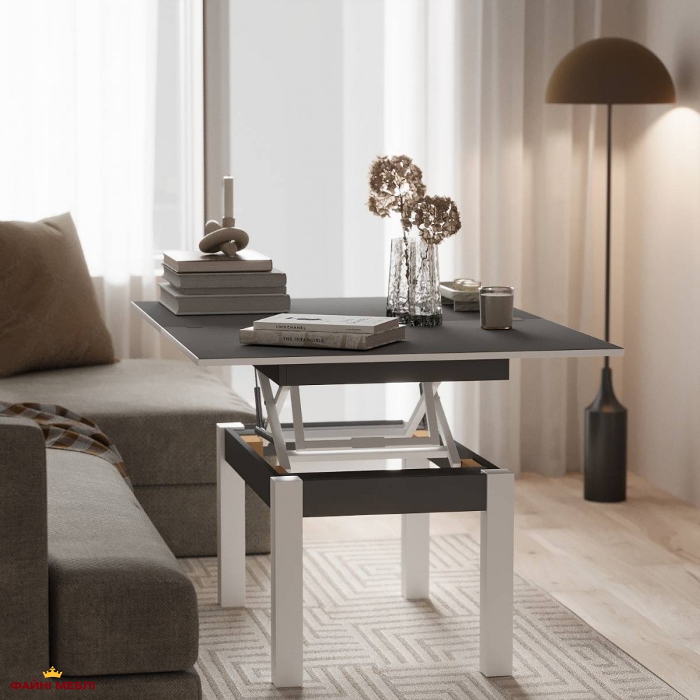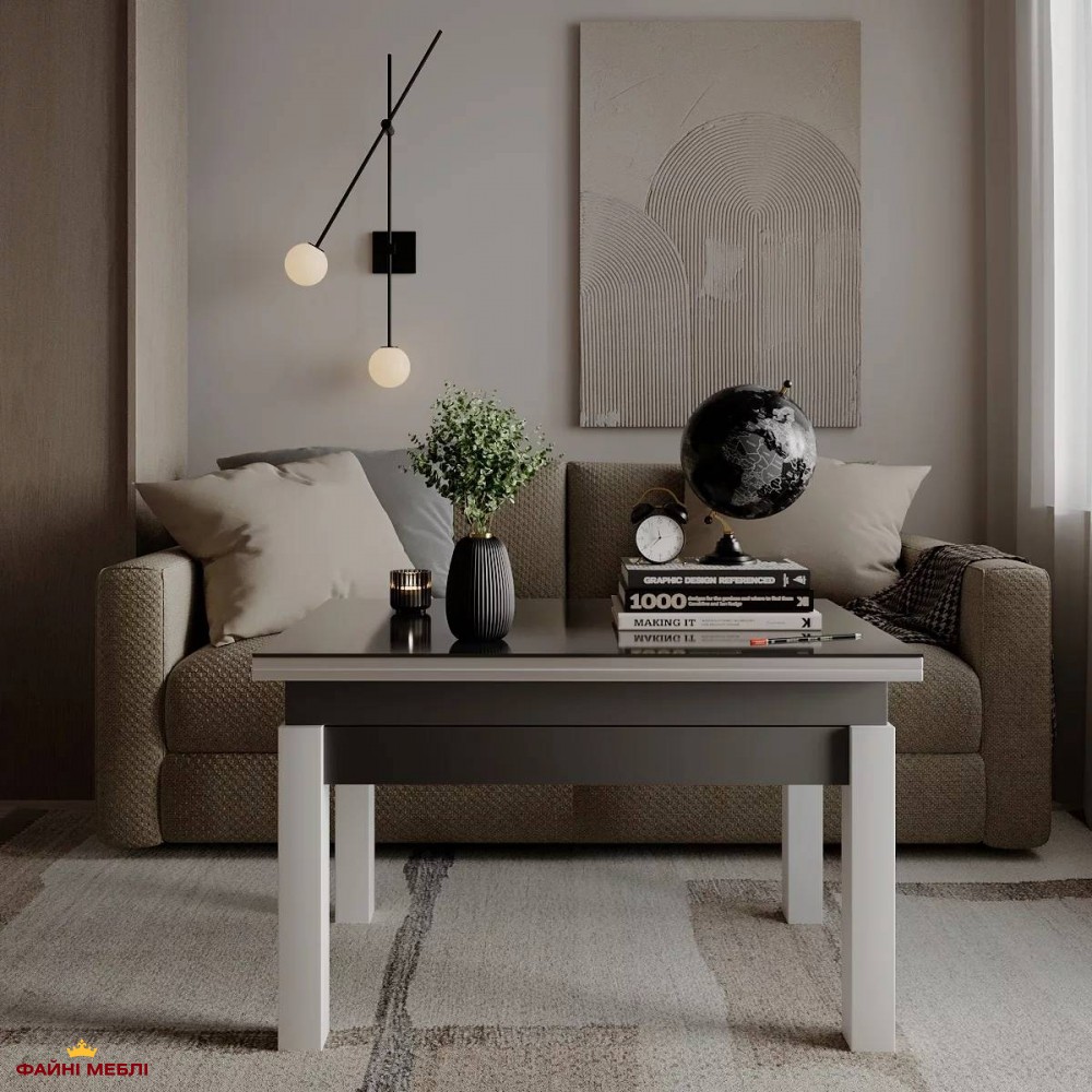 Стол-трансформер B-Fly Glass Art In Head в сочетании насыщенного Графита, контрастных Белых ножек и стильного Графитового стекла выглядит как выразительный архитектурный элемент интерьера. Тёмный корпус формирует глубину и визуальную основательность, тогда как светлые деревянные ножки добавляют лёгкий контраст и баланс композиции. Стеклянная поверхность в графитовом тоне усиливает современный характер модели и придаёт столу сдержанную элегантность. Конструкция выполнена из ЛДСП толщиной 16 мм и дополнена закалённым стеклом, что обеспечивает устойчивость к ежедневным нагрузкам и простоту в уходе. Надёжный металлический механизм из трубы и пружинной стали гарантирует плавную трансформацию без лишних усилий. В базовом формате это компактный журнальный стол для повседневного использования, но благодаря наличию механизма трансформации модель меняет пропорции: высота увеличивается с 51 до 75 см, а ширина — с 60 до 120 см, превращая его в полноценный обеденный вариант. Такой функционал позволяет легко адаптировать пространство под разные сценарии — от работы до приёма гостей.
