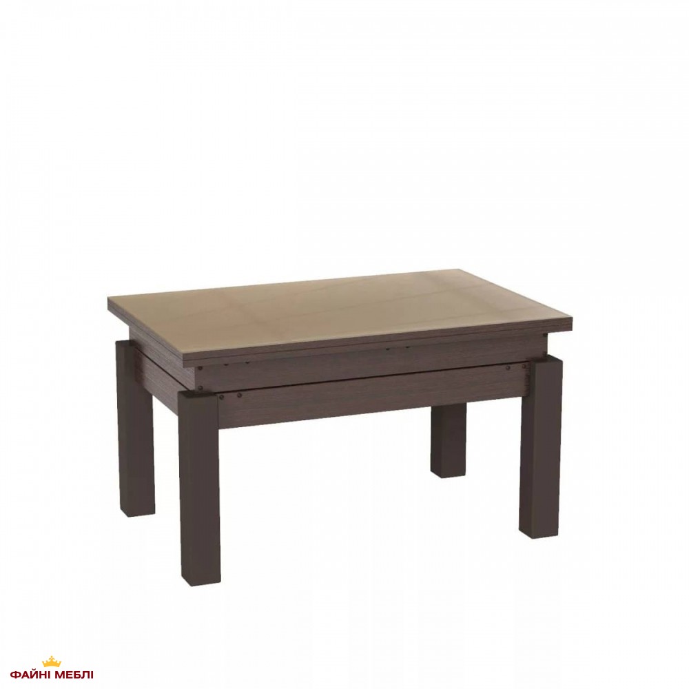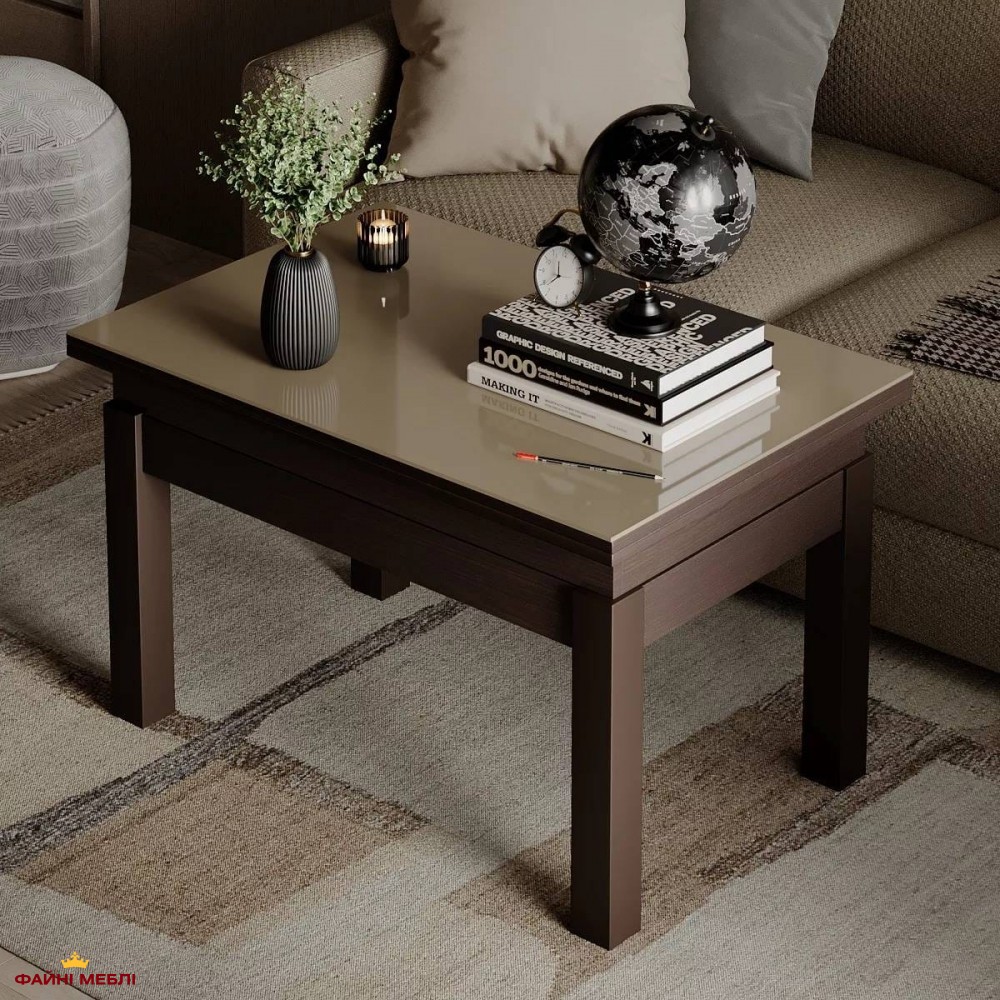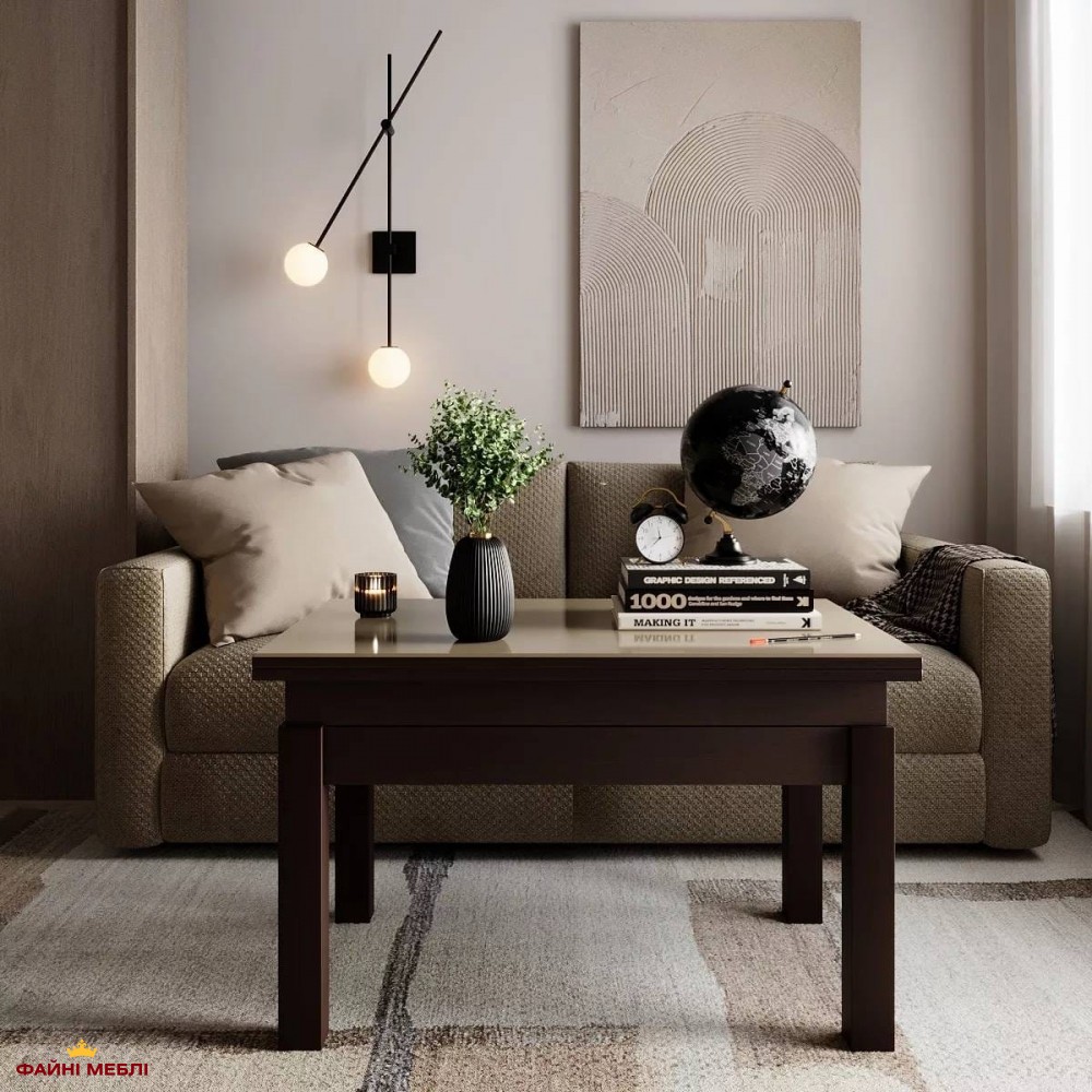 Стол-трансформер B-Fly Glass Art In Head в полностью тёмном исполнении Венге выглядит основательно и выразительно. Глубокий древесный оттенок корпуса и ножек формирует цельную монолитную композицию, которая придаёт интерьеру солидность и характер. Бежевое закалённое стекло мягко контрастирует с насыщенным тоном, смягчая тёмную палитру и добавляя тепла. Такой баланс делает модель уместной как в современных минималистичных пространствах, так и в интерьерах с классическими элементами. Конструкция выполнена из ЛДСП толщиной 16 мм, а деревянные ножки обеспечивают устойчивость в любом положении. Надёжный металлический механизм из трубы и пружинной стали работает плавно и позволяет изменять конфигурацию без лишних усилий. В сложенном состоянии это сдержанный журнальный стол, который не перегружает комнату, а благодаря наличию механизма трансформации модель легко переходит в обеденный формат: высота увеличивается с 51 до 75 см, а ширина — с 60 до 120 см. Это практичное решение для тех, кто ценит функциональность, не жертвуя эстетикой.