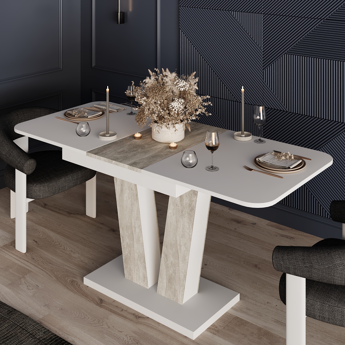 ЛДСП/МДФ — прочные и долговечные материалы для мебели, устойчивые к царапинам, влаге и механическим повреждениям. МДФ обладает ровной поверхностью для качественной обработки, а ЛДСП обеспечивает надёжность конструкции и практичность в использовании. - Синхронный механизм — позволяет легко увеличить размер столешницы для большой компании.