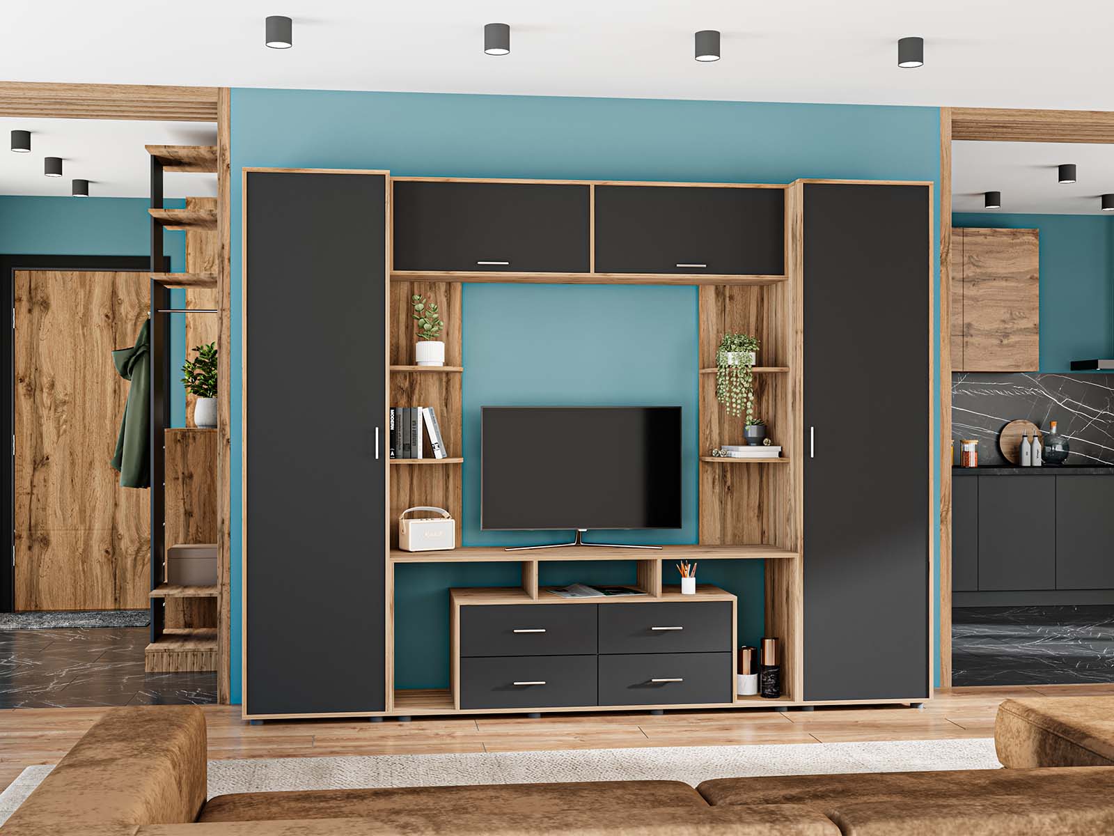 Стенка изготовлена из высококачественного ламинированного ДСП, которое отличается стойкостью к царапинам, влаге и ежедневным нагрузкам. Натуральное сочетание оттенка антрацит с акцентами дуба аппалаччи создаёт стильный современный образ.