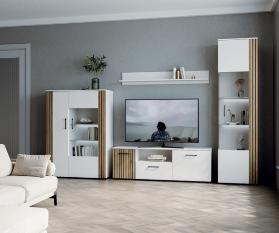 Комплект состоит из ТВ-тумбы, закрытых и открытых отделений, что позволяет максимально функционально использовать пространство возле телевизора, сохраняя эту зону аккуратной и визуально лёгкой.