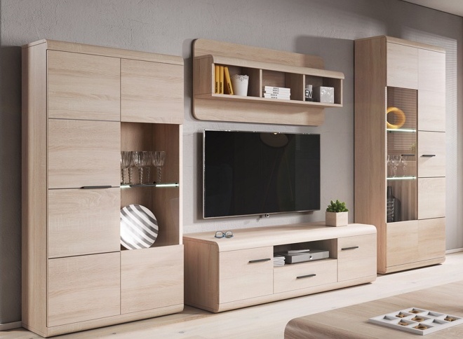 Стенка изготовлена из высококачественного ламинированного ДСП, которое отличается стойкостью к царапинам, влаге и ежедневным нагрузкам.Комплект состоит из ТВ-тумбы, закрытых и открытых отделений, что позволяет максимально функционально использовать пространство возле телевизора, сохраняя эту зону аккуратной и визуально лёгкой.