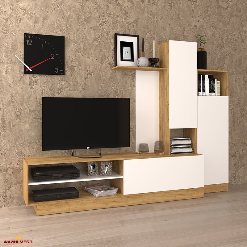 Комплект состоит из ТВ-тумбы, закрытых и открытых отделений, что позволяет максимально функционально использовать пространство возле телевизора, сохраняя эту зону аккуратной и визуально лёгкой.