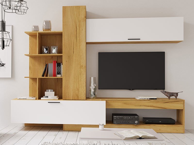 Комплект состоит из ТВ-тумбы, закрытых и открытых отделений, что позволяет максимально функционально использовать пространство возле телевизора, сохраняя эту зону аккуратной и визуально лёгкой.