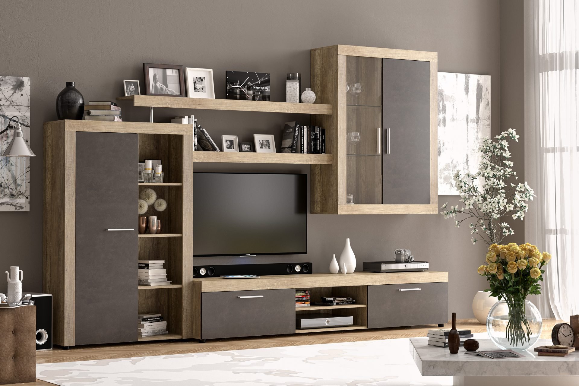 Универсальность. Вы получите стенку, которая одинаково хорошо подойдёт и для просторной, и для компактной комнаты, помогая максимально эффективно использовать площадь.