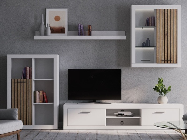 Стенка изготовлена из высококачественного ламинированного ДСП, которое отличается стойкостью к царапинам, влаге и ежедневным нагрузкам.Комплект состоит из ТВ-тумбы, закрытых и открытых отделений, что позволяет максимально функционально использовать пространство возле телевизора, сохраняя эту зону аккуратной и визуально лёгкой.