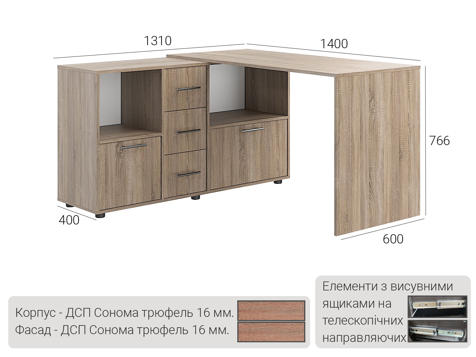 Стол изготовлен из ламинированного ДСП — прочного и износостойкого материала, который легко очищается и сохраняет аккуратный внешний вид длительное время. Оттенок Дуб сонома трюфель создает стильный контраст и придает мебели современный характер. Модель оснащена четырьмя вместительными ящиками на телескопических направляющих, которые обеспечивают плавное и тихое выдвижение. Две открытые ниши позволяют удобно разместить книги и часто используемые предметы, а две закрытые полки за дверцами помогают скрыть вещи и поддерживать порядок в рабочей зоне. Просторная столешница подходит для размещения компьютера, ноутбука, документов и письменных принадлежностей, создавая комфортные условия для учебы или работы. Стол поставляется в разобранном виде и комплектуется инструкцией и полным набором фурнитуры для сборки.