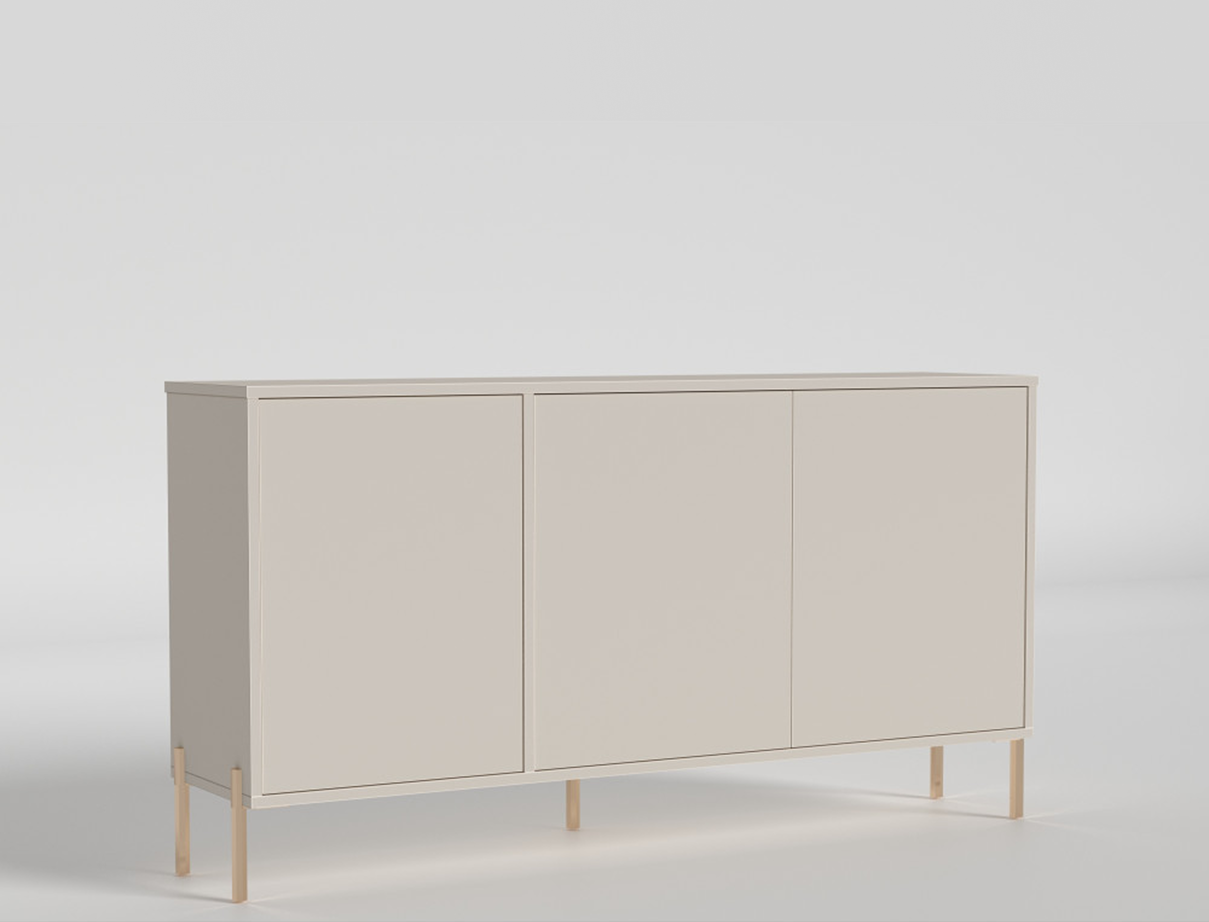 Тумба изготовлена из ламинированной ДСП класса E1 толщиной 18 мм, которая используется как для корпуса, так и для фасадов, обеспечивая прочность конструкции и аккуратный внешний вид в повседневной эксплуатации. Модель выполнена в нескольких цветовых комбинациях: Сатин, Шиншила серая, Бетон светлый, Бетон темный, Дуб эвок окаменелый, Капучино, Дуб кремона торро, что позволяет легко подобрать вариант под интерьер гостиной. Конструкция состоит из трех закрытых секций с полками, что делает хранение максимально упорядоченным. Открывание фасадов реализовано за счет системы Tip-On GTV, которая поддерживает минималистичный дизайн без использования ручек. Опора выполнена на металлических ножках, придающих мебели визуальную легкость и устойчивость.