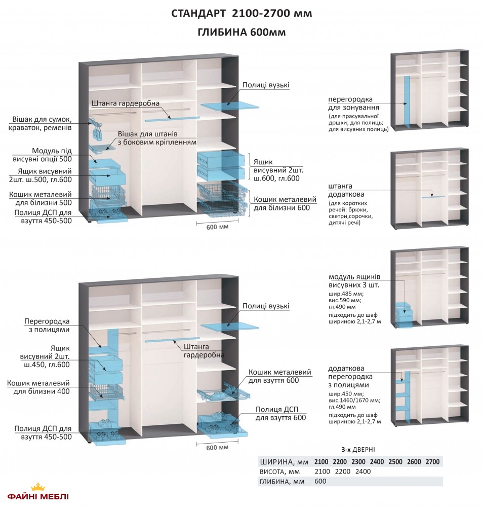 - Висота: 210 / 220 / 240 см