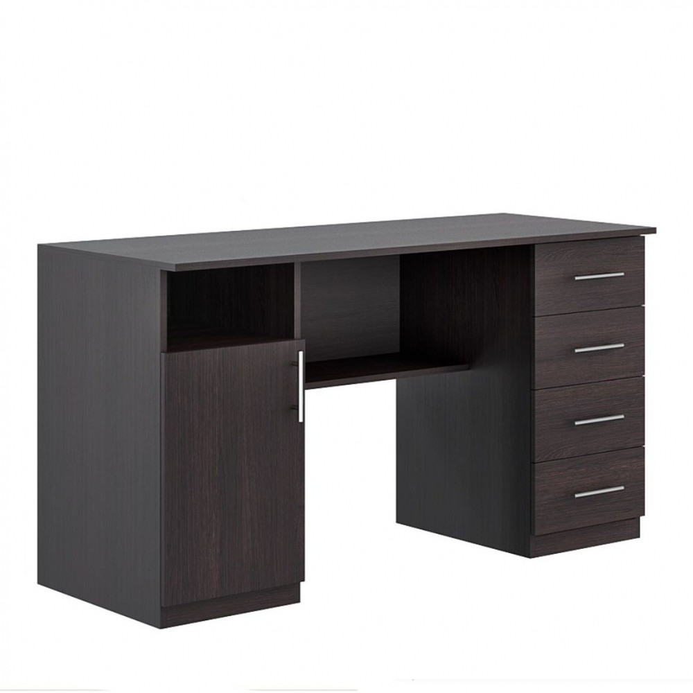 Стіл виготовлений з ламінованого ДСП, що забезпечує міцність, зносостійкість і легкість у догляді. Венге темний додає меблям елегантності та гармонійно пасує до сучасного інтер’єру. Конструкція передбачає чотири шухляди для зберігання документів, канцтоварів чи особистих речей, відкриту поличку під робочою поверхнею та відкриту нішу, яка зручно розташована для швидкого доступу до потрібних предметів. Дві закриті полиці за дверцятами дозволяють приховати речі, які не використовуються щодня. Металеві релінг-ручки та роликові направляючі забезпечують зручне і плавне відкривання. Простора стільниця дозволяє розмістити комп’ютер, ноутбук, книги та робочі приладдя, створюючи комфортну зону для продуктивної роботи або навчання. Стіл постачається в розібраному вигляді та комплектується інструкцією й повним набором фурнітури для монтажу.