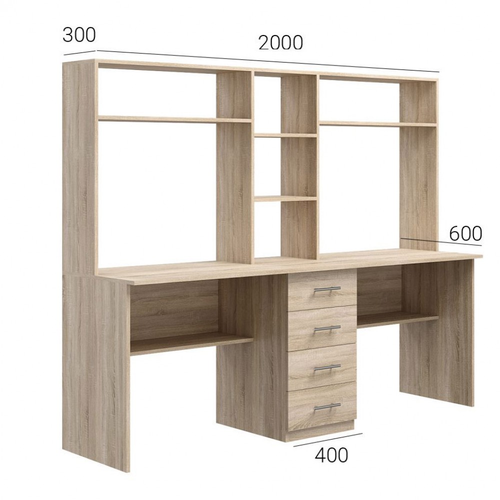 Стіл виготовлений із ламінованого ДСП — міцного та зносостійкого матеріалу, який витримує щоденне використання і легко очищається від пилу та забруднень. Форма та колір Дуб Сонома надають виробу природного вигляду і створюють відчуття затишку в робочій зоні. Конструкція передбачає чотири місткі шухляди, де можна зберігати канцелярські приладдя, документи, дрібні гаджети чи особисті речі. Над робочими зонами розміщено відкриті полиці, які стануть у пригоді для книжок, блокнотів або декоративних елементів. Шухляди обладнані роликовими направляючими, що забезпечують плавний та тихий хід, а металеві релінг-ручки роблять відкривання зручним і надійним. Велика робоча поверхня дозволяє одночасно розмістити два ноутбуки, комп’ютерну техніку чи письмові приналежності, створюючи комфортні умови для праці або навчання одразу двох користувачів. Стіл поставляється в розібраному вигляді та комплектується інструкцією й повним набором фурнітури для монтажу.