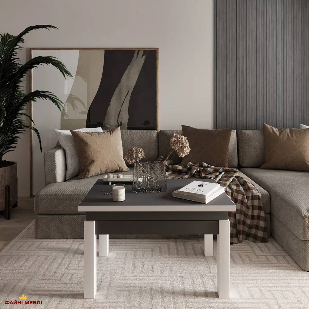 Стіл-трансформер B-Fly Art In Head Графіт / Білий діамант — це гармонійне поєднання теплої деревної текстури та чистої сучасної геометрії. Відтінок Графіт створює відчуття затишку та природності, наповнюючи інтер’єр світлом і спокоєм, тоді як Білий діамант дерев’яні ніжки додають композиції легкості й візуального балансу. Такий дует виглядає універсально та доречно як у вітальні, так і на кухні чи в компактному студійному просторі. Конструкція виготовлена з ЛДСП товщиною 16 мм, що забезпечує міцність і стійкість до щоденного навантаження, а натуральні ніжки з дерева формують надійну опору. У складеному форматі стіл компактний і не перевантажує приміщення, проте завдяки механізм трансформації швидко змінює конфігурацію, збільшуючи площу та висоту для комфортного обіднього використання. Це модель, яка органічно вписується в сучасний ритм життя, поєднуючи естетику, компактність і функціональність.