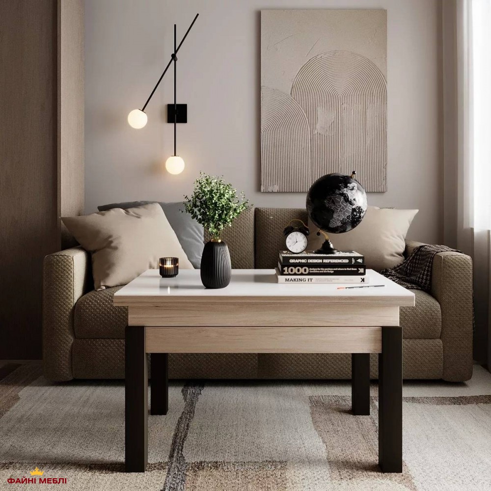 Стіл-трансформер B-Fly Glass Art In Head у поєднанні Гікорі рокфорд світлий, глибокого відтінку Венге та витонченого Білого скла створює інтер’єрний акцент із відчуттям чистоти та простору. Світлий деревний корпус додає тепла, тоді як білосніжна скляна поверхня візуально розширює кімнату й робить конструкцію більш «повітряною». Темні дерев’яні ніжки формують чітку основу, підкреслюючи стабільність і баланс дизайну. Стільниця виконана з ЛДСП товщиною 16 мм та доповнена загартованим склом, що забезпечує зносостійкість і легкість у догляді. Конструкція оснащена надійним металевим механізмом із металевої труби та пружинної сталі, завдяки чому зміна формату відбувається плавно й без зусиль. У складеному вигляді це компактний журнальний стіл для щоденного користування, а завдяки наявності механізму трансформації він швидко переходить у обідній формат: висота змінюється з 51 до 75 см, а ширина — з 60 до 120 см. Такий функціонал особливо цінний для смарт-квартир і просторів, де важливо максимально ефективно використовувати кожен метр. B-Fly Glass — це поєднання практичності, надійності та світлої сучасної естетики.
