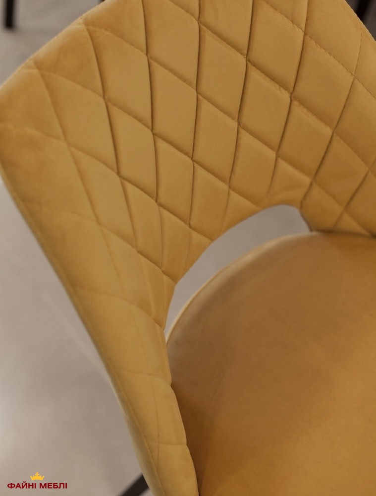 Каркас стільця виготовлений із міцного металу, покритого стійкою порошковою фарбою, що захищає від корозії та подряпин. Сидіння виконане з м’якого, приємного на дотик матеріалу — тканини або велюру високої щільності, що зберігає форму навіть після тривалого використання. Оббивка легко очищується, не вигоряє на сонці та має підвищену зносостійкість.
