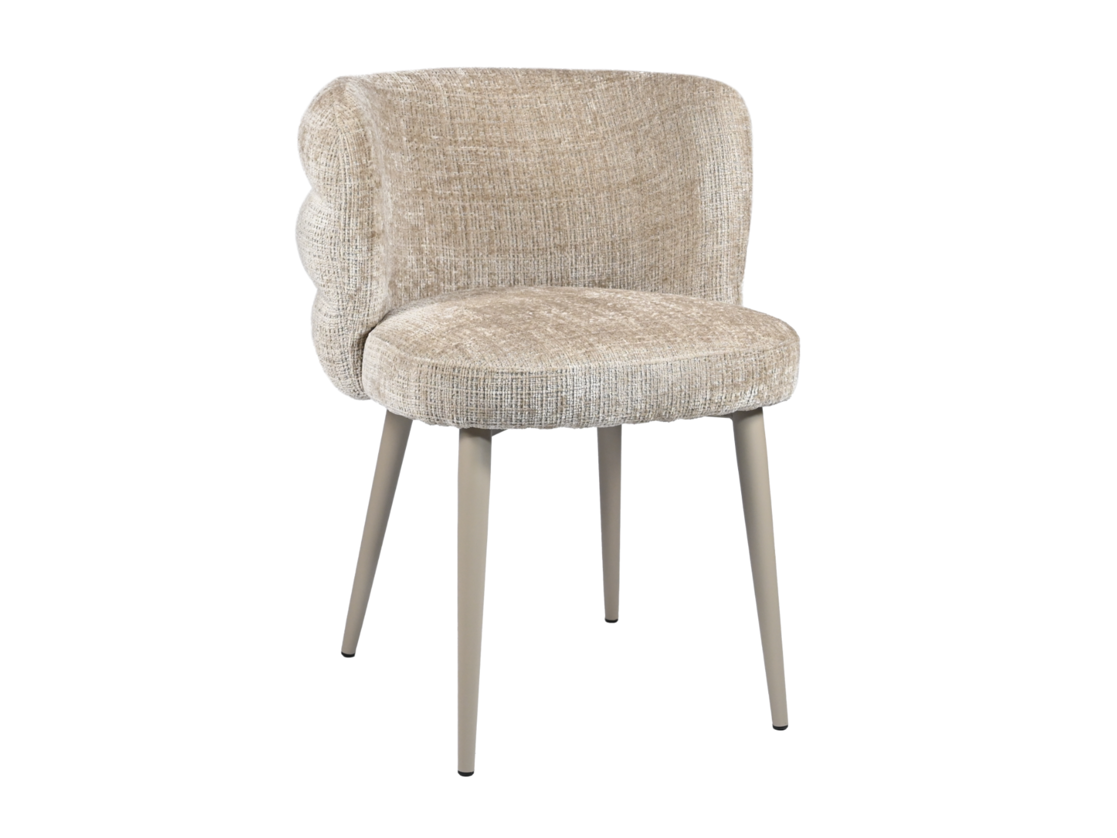 Каркас стільця виготовлений із міцного металу, покритого стійкою порошковою фарбою, що захищає від корозії та подряпин. Сидіння виконане з м’якого, приємного на дотик матеріалу — тканини або велюру високої щільності, що зберігає форму навіть після тривалого використання. Оббивка легко очищується, не вигоряє на сонці та має підвищену зносостійкість.