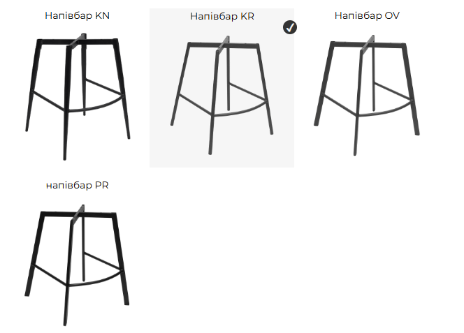 Каркас стільця виготовлений із міцного металу, покритого стійкою порошковою фарбою, що захищає від корозії та подряпин. Сидіння виконане з м’якого, приємного на дотик матеріалу — тканини або велюру високої щільності, що зберігає форму навіть після тривалого використання. Оббивка легко очищується, не вигоряє на сонці та має підвищену зносостійкість. Стандартна опора KR.