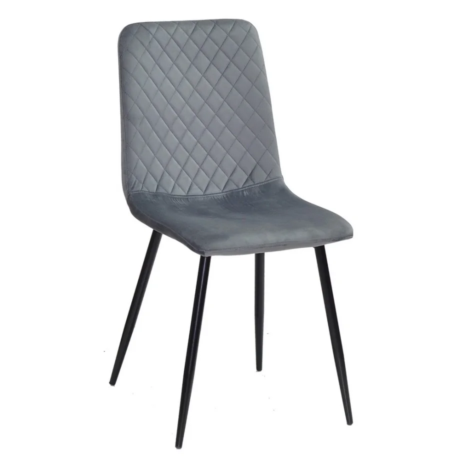 Каркас стільця виготовлений із міцного металу, покритого стійкою порошковою фарбою, що захищає від корозії та подряпин. Сидіння виконане з м’якого, приємного на дотик матеріалу — тканини або велюру високої щільності, що зберігає форму навіть після тривалого використання. Оббивка легко очищується, не вигоряє на сонці та має підвищену зносостійкість.
