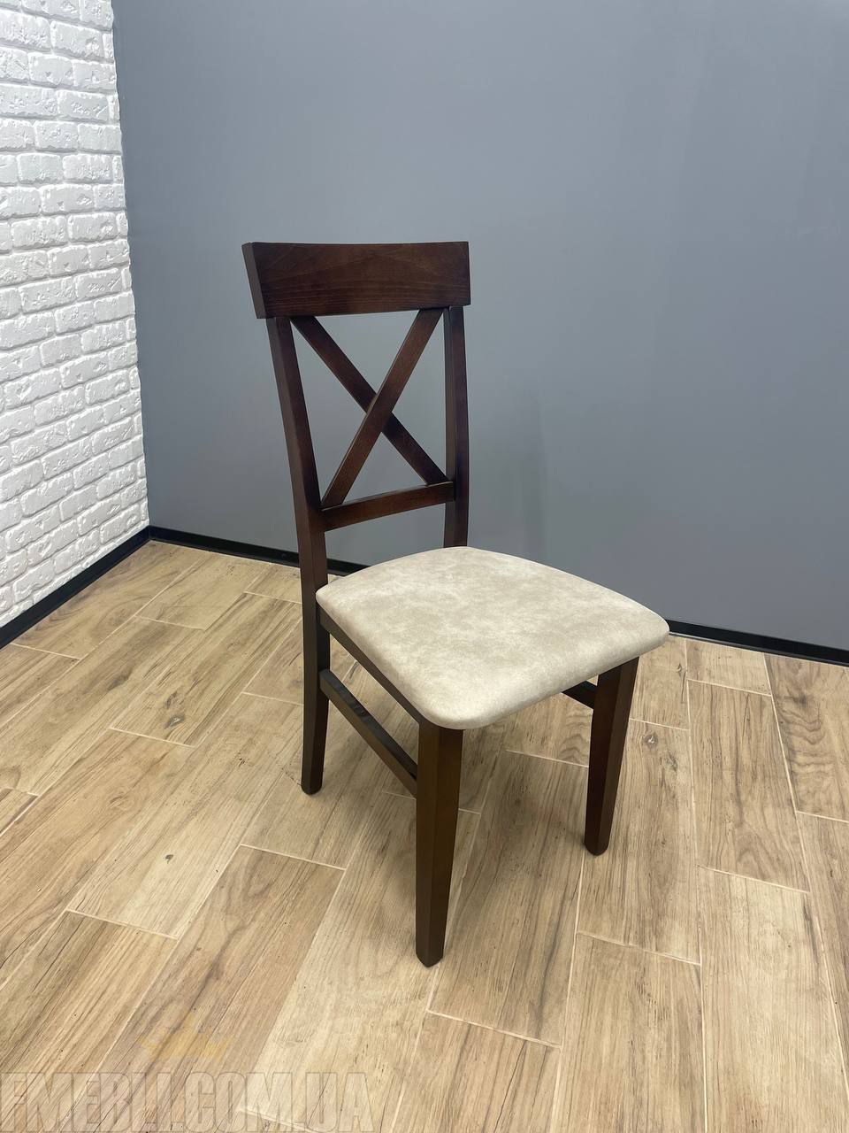 Каркас стільця виготовлений із натурального дерева. Сидіння виконане з м’якого, приємного на дотик матеріалу — тканини або велюру високої щільності, що зберігає форму навіть після тривалого використання. Оббивка легко очищується, не вигоряє на сонці та має підвищену зносостійкість.