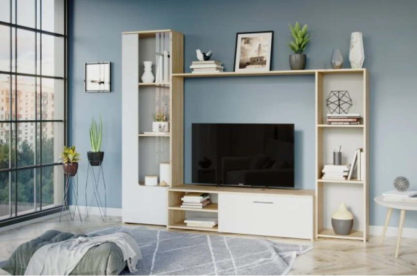 Стінка виготовлена з високоякісного ламінованого ДСП, яке відзначається стійкістю до подряпин, вологи та повсякденних навантажень. Натуральне поєднання кольору дуб сонома з акцентами німфеа альби створює стильний сучасний вигляд. Комплект складається з ТВ-тумби, закритих та відкритих відділень, дозволяючи вам максимально функціонально використовувати простір біля телевізора, залишаючи цю зону не перенавантаженою та естетичною.