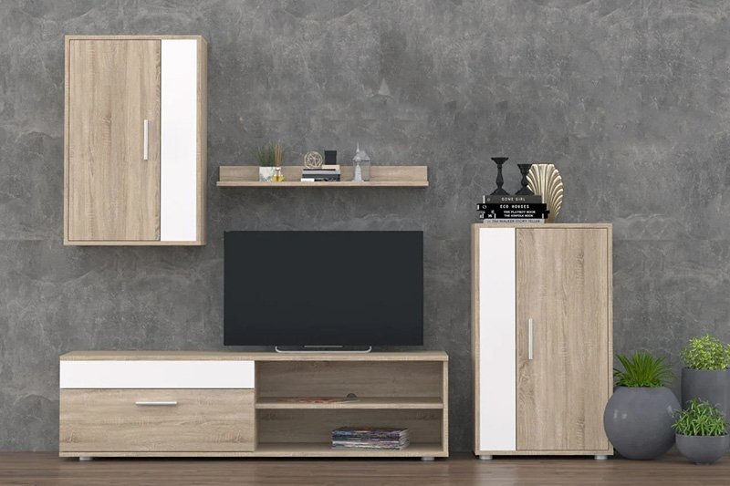 Стінка виготовлена з високоякісного ламінованого ДСП, яке відзначається стійкістю до подряпин, вологи та повсякденних навантажень. Натуральне поєднання кольору дуб сонома з акцентами німфеї альба створює стильний сучасний вигляд. Комплект складається з ТВ-тумби, закритих та відкритих відділень, дозволяючи вам максимально функціонально використовувати простір біля телевізора, залишаючи цю зону не перенавантаженою та естетичною.