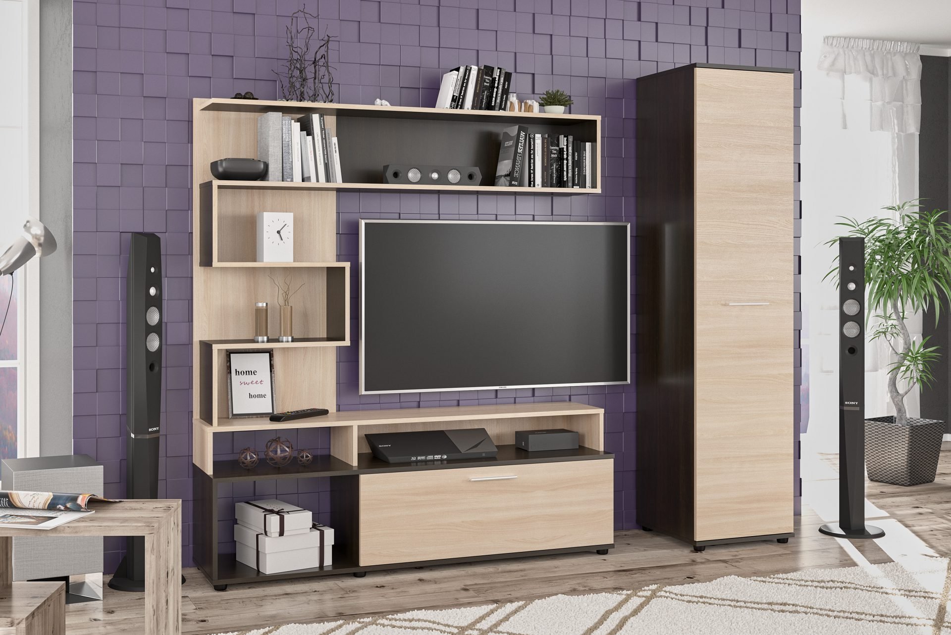 Стінка виготовлена з високоякісного ламінованого ДСП, яке відзначається стійкістю до подряпин, вологи та повсякденних навантажень. Натуральне поєднання кольору венге темний з акцентами світлого ясена створює стильний сучасний вигляд. Комплект складається з ТВ-тумби, закритих та відкритих відділень, дозволяючи вам максимально функціонально використовувати простір біля телевізора, залишаючи цю зону не перенавантаженою та естетичною.