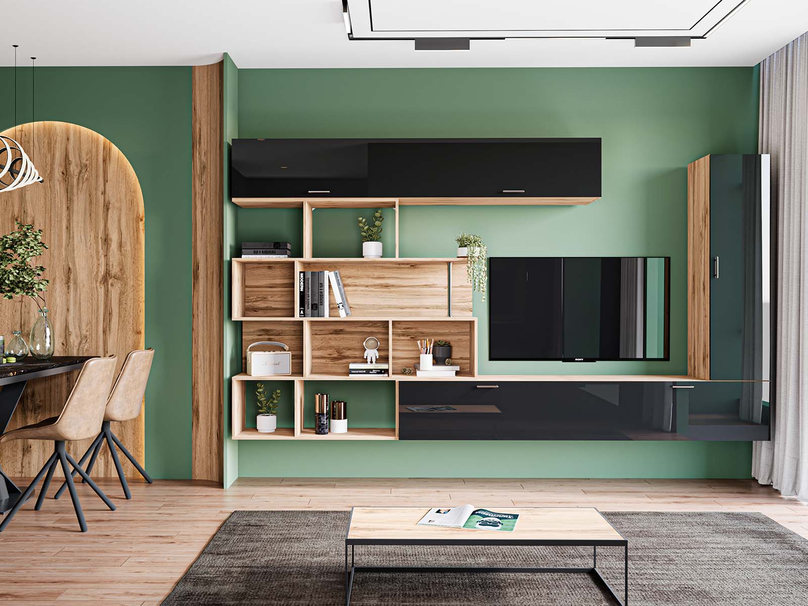 Універсальність. Ви отримаєте стінку, яка ідеально пасуватиме як до просторої вітальні, так і до компактної кімнати, допомагаючи максимально раціонально використати площу.