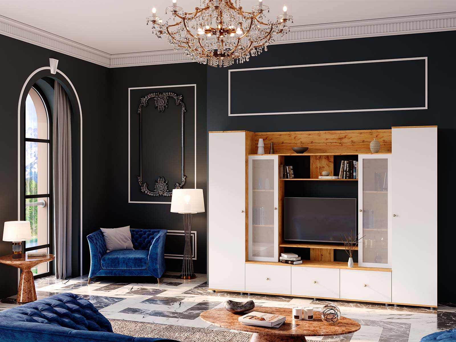 Універсальність. Ви отримаєте стінку, яка ідеально пасуватиме як до просторої вітальні, так і до компактної кімнати, допомагаючи максимально раціонально використати площу.