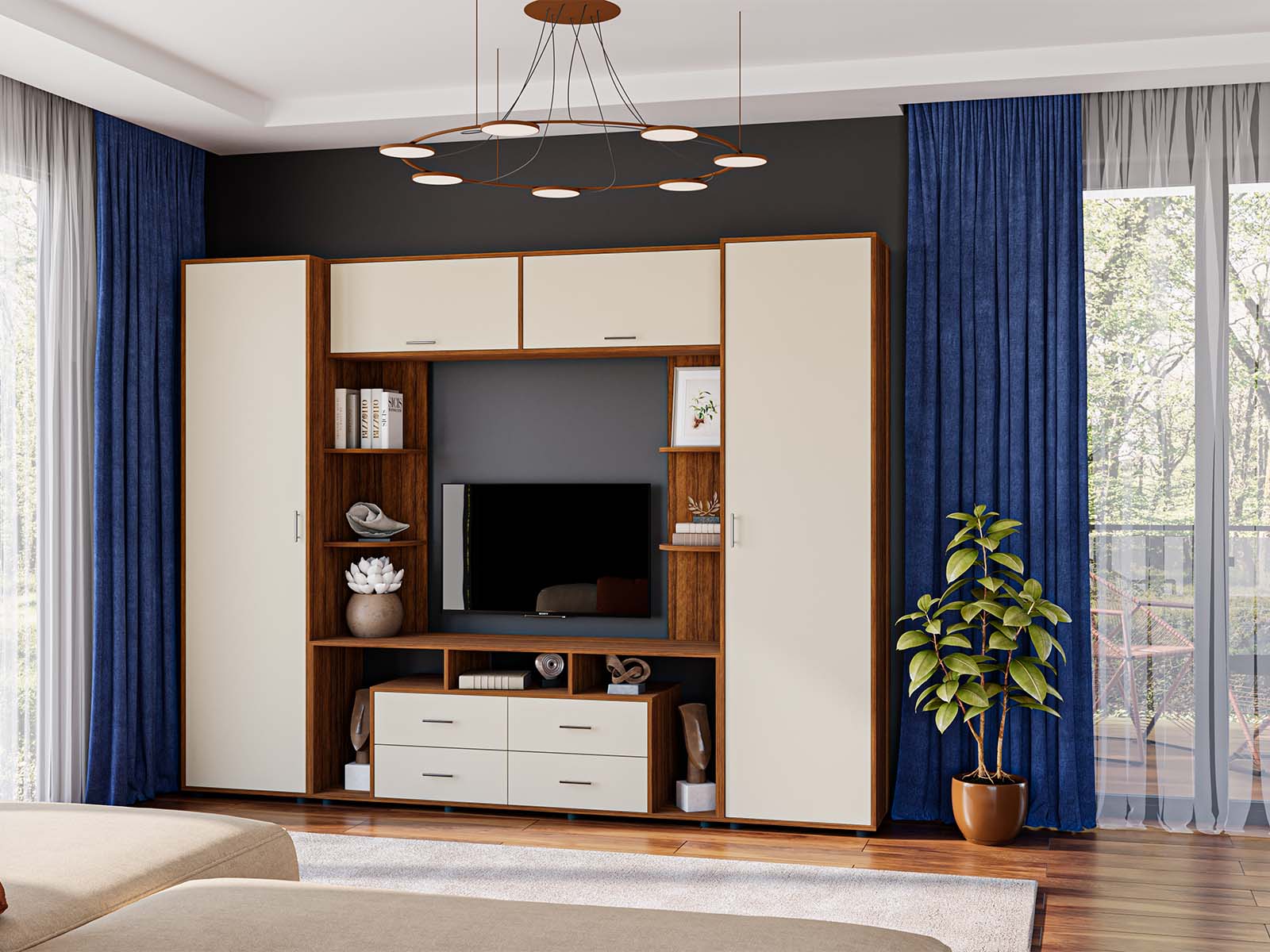 Універсальність. Ви отримаєте стінку, яка ідеально пасуватиме як до просторої вітальні, так і до компактної кімнати, допомагаючи максимально раціонально використати площу.