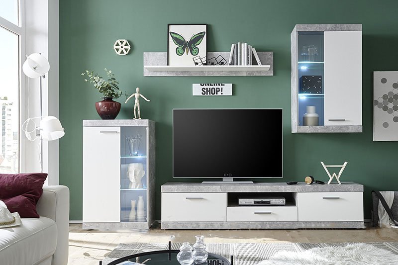 Стінка виготовлена з високоякісного ламінованого ДСП, яке відзначається стійкістю до подряпин, вологи та повсякденних навантажень. Натуральне поєднання кольору бетон з акцентами білого створює стильний сучасний вигляд. Комплект складається з ТВ-тумби, закритих та відкритих відділень, дозволяючи вам максимально функціонально використовувати простір біля телевізора, залишаючи цю зону не перенавантаженою та естетичною.