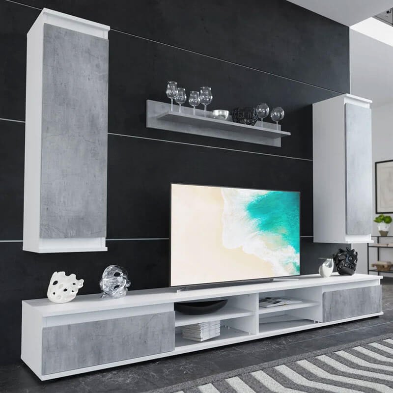 Стінка виготовлена з високоякісного ламінованого ДСП, яке відзначається стійкістю до подряпин, вологи та повсякденних навантажень. Натуральне поєднання кольору бетон з акцентами німфея альби створює стильний сучасний вигляд. Комплект складається з ТВ-тумби, закритих та відкритих відділень, дозволяючи вам максимально функціонально використовувати простір біля телевізора, залишаючи цю зону не перенавантаженою та естетичною.