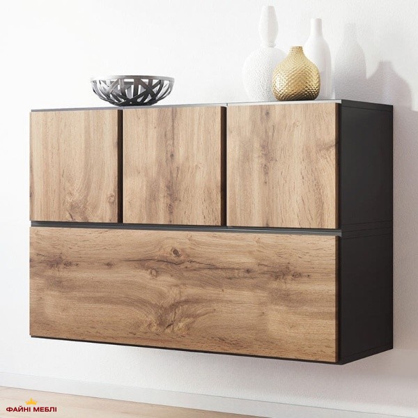 Стінка виготовлена з високоякісного ламінованого ДСП, яке відзначається стійкістю до подряпин, вологи та повсякденних навантажень. Комплект складається з закритих відділень.