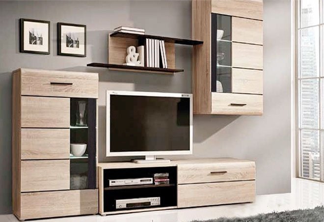 Стінка виготовлена з високоякісного ламінованого ДСП, яке відзначається стійкістю до подряпин, вологи та повсякденних навантажень.Комплект складається з ТВ-тумби, закритих та відкритих відділень, дозволяючи вам максимально функціонально використовувати простір біля телевізора, залишаючи цю зону не перенавантаженою та естетичною.