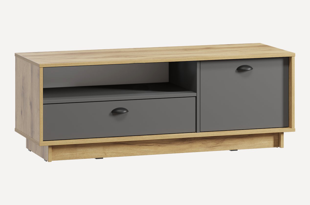Тумба під ТВ Куба RTV128 поєднує стиль, зручність і практичність у компактному форматі. Її корпус і фасади виготовлені з ЛДСП, а поєднання кольорів Дуб Аппалачі/Антрацит додає виробу сучасного та елегантного вигляду. Пластикові ручки роблять користування шухлядами легким і комфортним, а телескопічні напрямні повного висуву забезпечують плавний хід і зручний доступ до речей. Тумба доступна в кількох модифікаціях — з правою або лівою стороною, щоб максимально відповідати вашим потребам і плануванню кімнати. Виріб комплектується інструкцією та повним набором фурнітури для самостійного монтажу, а розбірна конструкція робить транспортування і складання простим і зручним. Кожен елемент продуманий так, щоб тумба була не лише функціональною, а й стильним акцентом вашої вітальні.