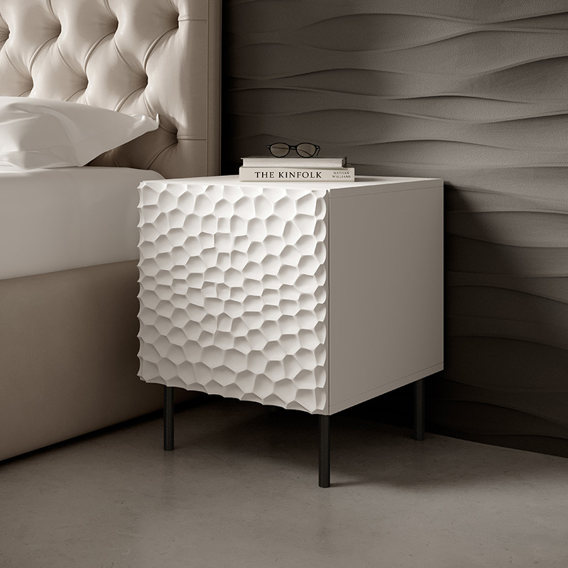 Приліжкова тумба Cama Hole/Хоул виготовлена з надійного ЛДСП, а фасади з МДФ прикрашені оригінальним фрезеруванням у вигляді неправильних заглиблень, що додає виробу характеру та стильності. Відкривання шухляд відбувається за системою push-click, тож ручки не потрібні — усе працює легко та тихо. Тумба встановлена на чорних металевих ніжках, виготовляється у білому матовому кольорі, а дверні петлі можна закріпити як для лівого, так і для правого відкривання. У комплекті йде інструкція та повний набір фурнітури, а розбірна конструкція робить транспортування та самостійне встановлення максимально зручними.