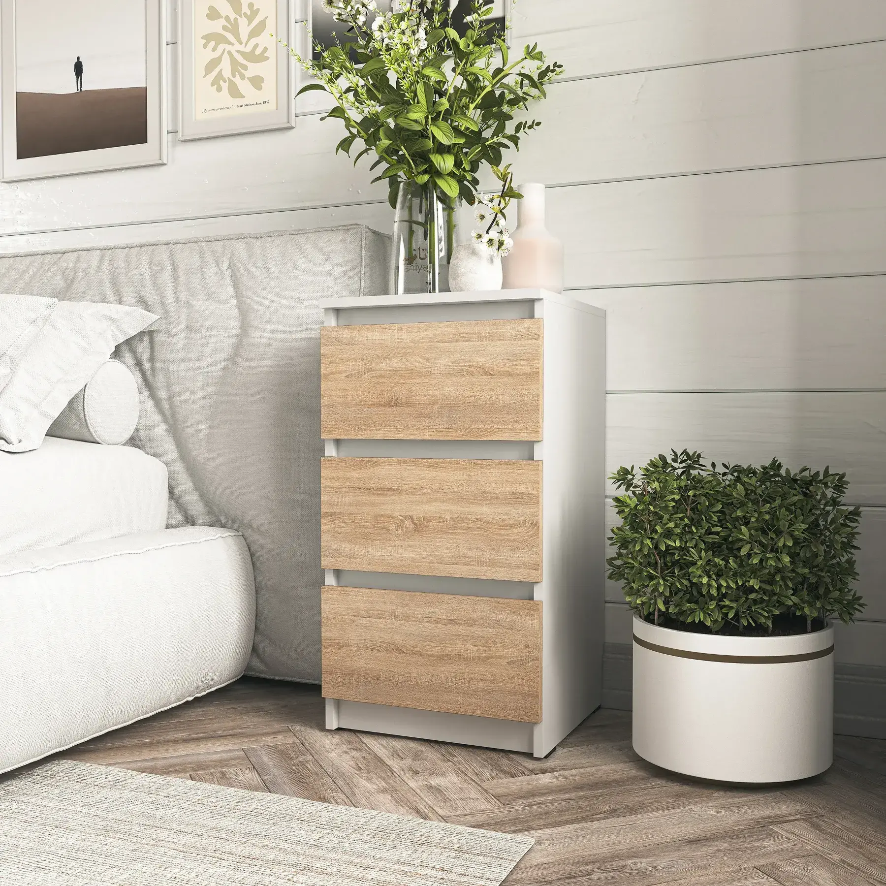 Приліжкова тумба Moreli T216 виготовлена з корпусу та фасаду з ЛДСП, що забезпечує надійність і охайний сучасний вигляд. Модель відкривається за край фасаду, без зайвих ручок, що підкреслює її мінімалістичний стиль, а телескопічні напрямні повного висування гарантують плавний і зручний доступ до вмісту шухляд. Тумба доступна у поєднанні кольорів Білий/Дуб Сонома, що легко вписується в світлий та затишний інтер’єр. У комплект входить детальна інструкція та повний набір фурнітури для самостійного монтажу, а розбірна конструкція робить транспортування та встановлення швидким і максимально зручним.