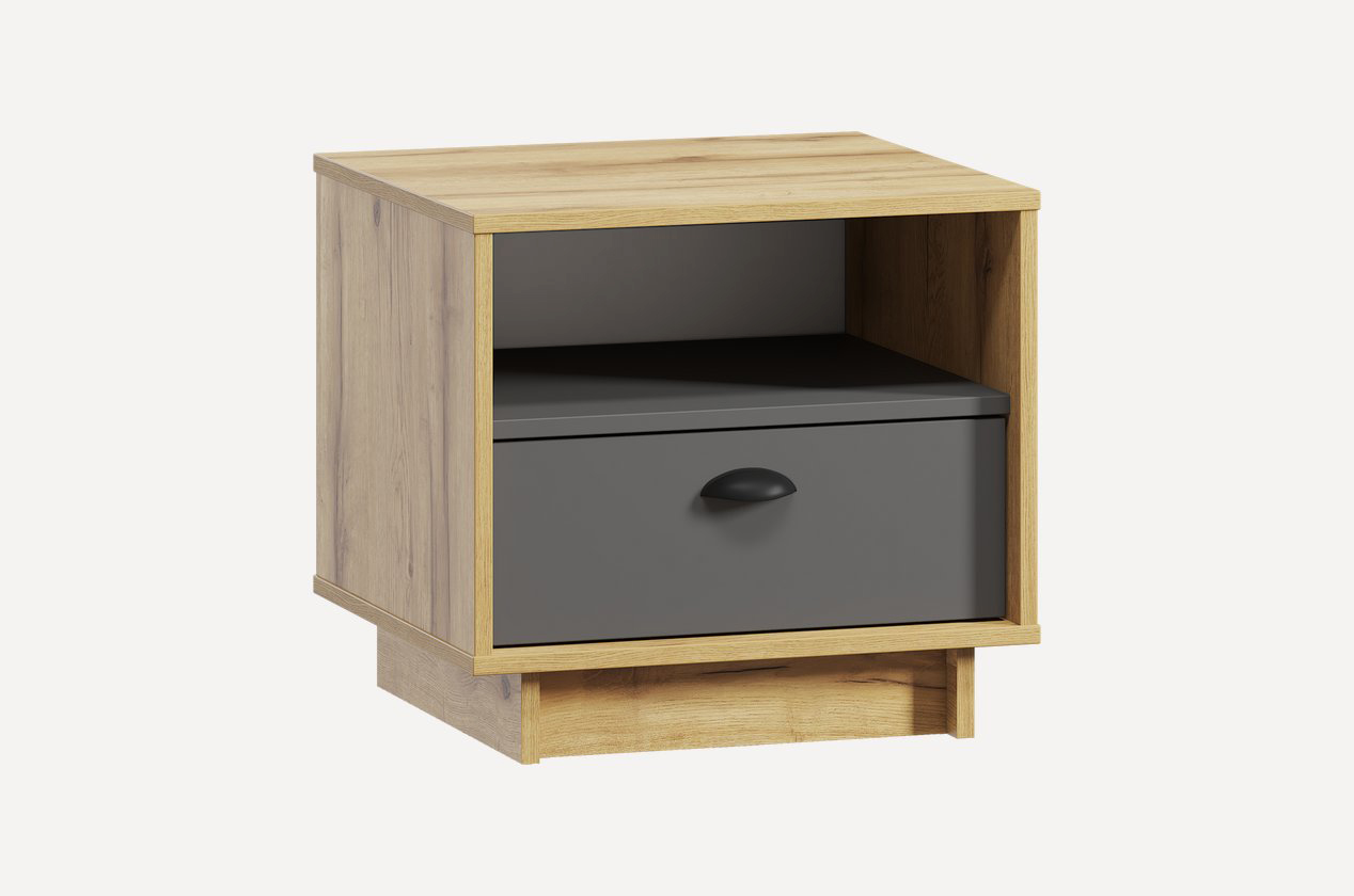 Приліжкова тумба Moreli Kuba/Куба виготовлена з корпусу та фасаду з ЛДСП, що забезпечує міцність і сучасний вигляд. Пластикові ручки роблять користування зручним, а телескопічні напрямні повного висування гарантують плавний доступ до шухляд. Модель у кольорах Дуб Аппалачі/Антрацит поєднує стиль і функціональність, створюючи практичний простір для зберігання всього необхідного поруч із ліжком. У комплекті є інструкція та повний набір фурнітури для самостійного монтажу, а розбірна конструкція робить транспортування й встановлення тумби простими та комфортними.