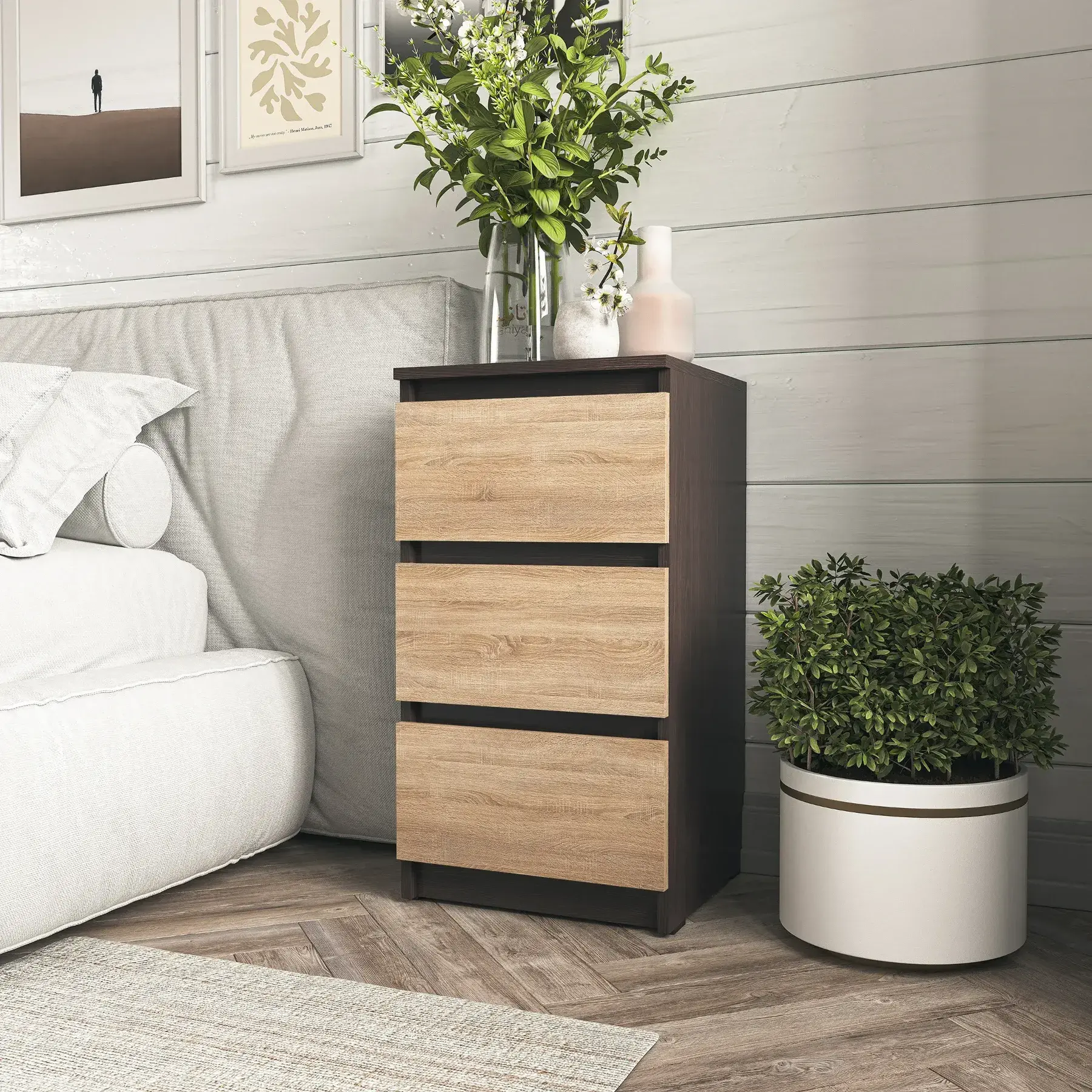 Приліжкова тумба Moreli T216 виготовлена з корпусу та фасаду з ЛДСП, що робить її міцною та сучасною. Відкривання за край фасаду додає мінімалістичного і елегантного вигляду, а телескопічні напрямні повного висування забезпечують легкий і плавний доступ до шухляд. Модель представлена у поєднанні кольорів Венге темний/Дуб Сонома, що додає інтер’єру глибини та затишку. У комплект входить детальна інструкція та повний набір фурнітури для самостійного монтажу, а розбірна конструкція дозволяє легко транспортувати тумбу та швидко встановити її у будь-якому приміщенні.