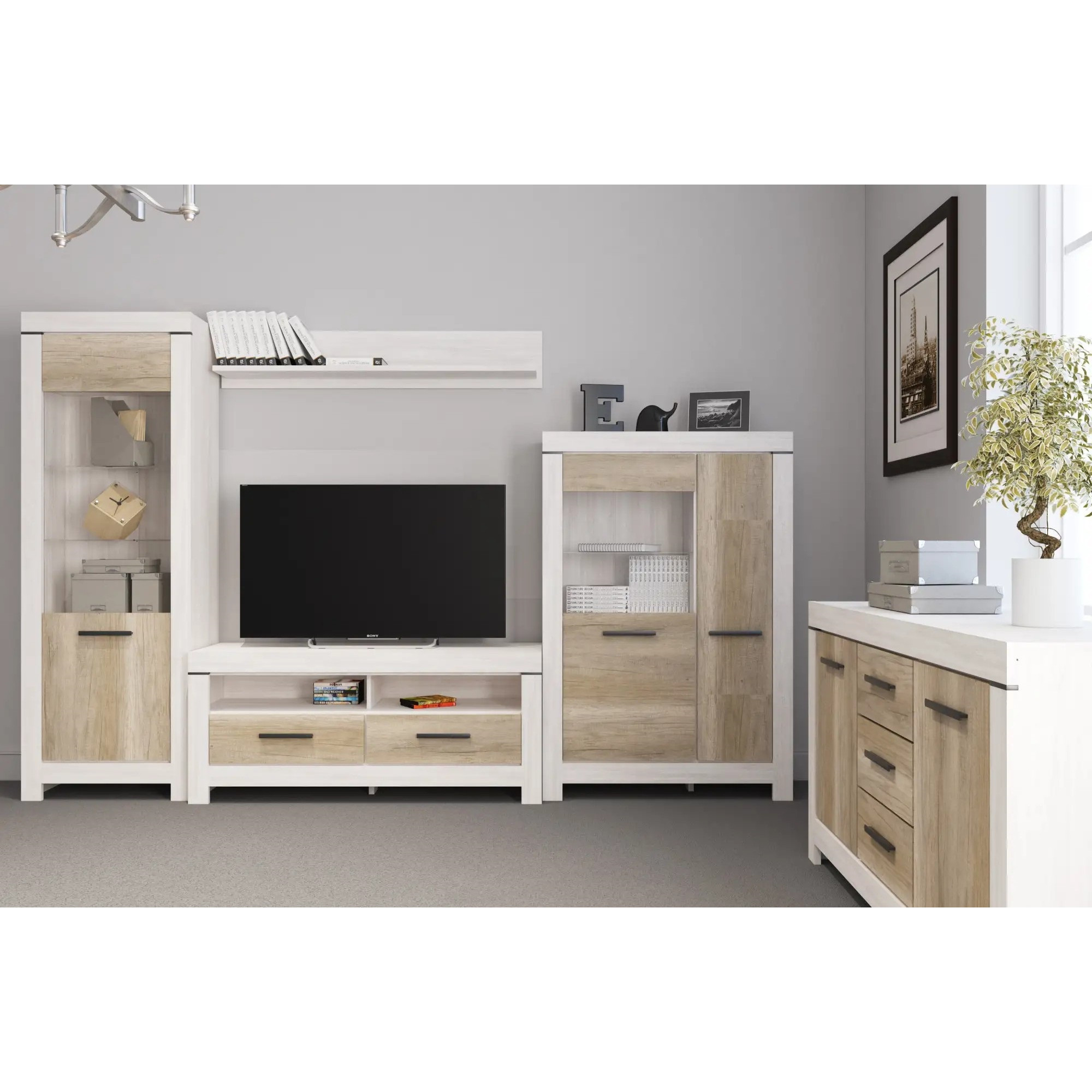 Система Белен виробляється з високоякісного ламінованого ДСП , що забезпечує стабільність форми, стійкість до зносу й привабливий вигляд. Металеві ручки додають стилю і міцності. Модулі комплекту можуть включати ТВ тумбу, вітрини, навісна полиця, комод — ви самі обираєте конфігурацію вашого простору.