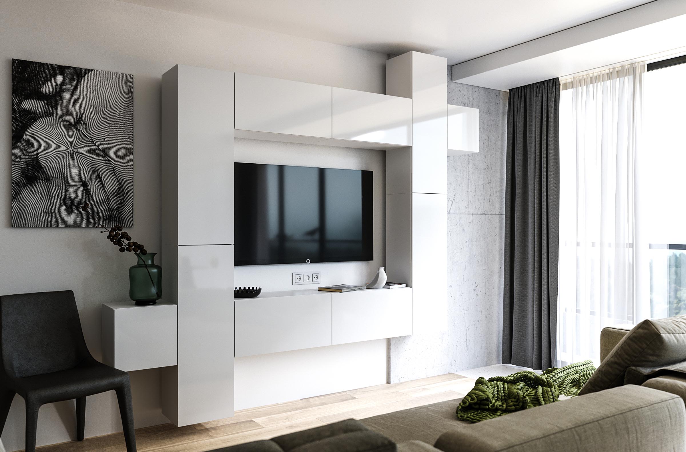 Стінка виготовлена з високоякісного ламінованого ДСП, яке відзначається стійкістю до подряпин, вологи та повсякденних навантажень. Натуральне поєднання кольору білий глянець з акцентами чорного глянцю створює стильний сучасний вигляд. Комплект складається з ТВ-тумби, закритих та відкритих відділень, дозволяючи вам максимально функціонально використовувати простір біля телевізора, залишаючи цю зону не перенавантаженою та естетичною.