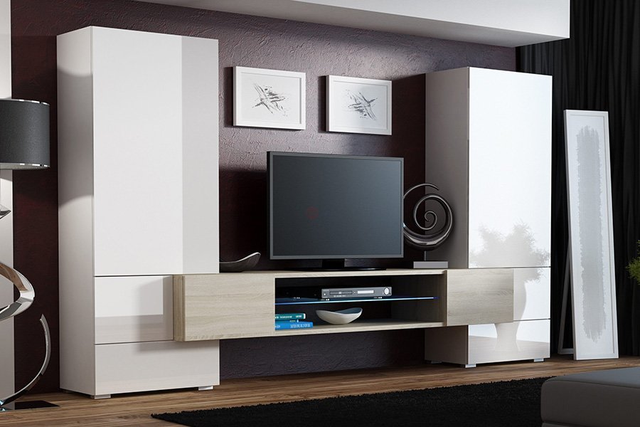 Стінка виготовлена з високоякісного ламінованого ДСП, яке відзначається стійкістю до подряпин, вологи та повсякденних навантажень. Натуральне поєднання кольору чорний мат з акцентами білого глянцю створює стильний сучасний вигляд. Комплект складається з ТВ-тумби, закритих та відкритих відділень, дозволяючи вам максимально функціонально використовувати простір біля телевізора, залишаючи цю зону не перенавантаженою та естетичною.